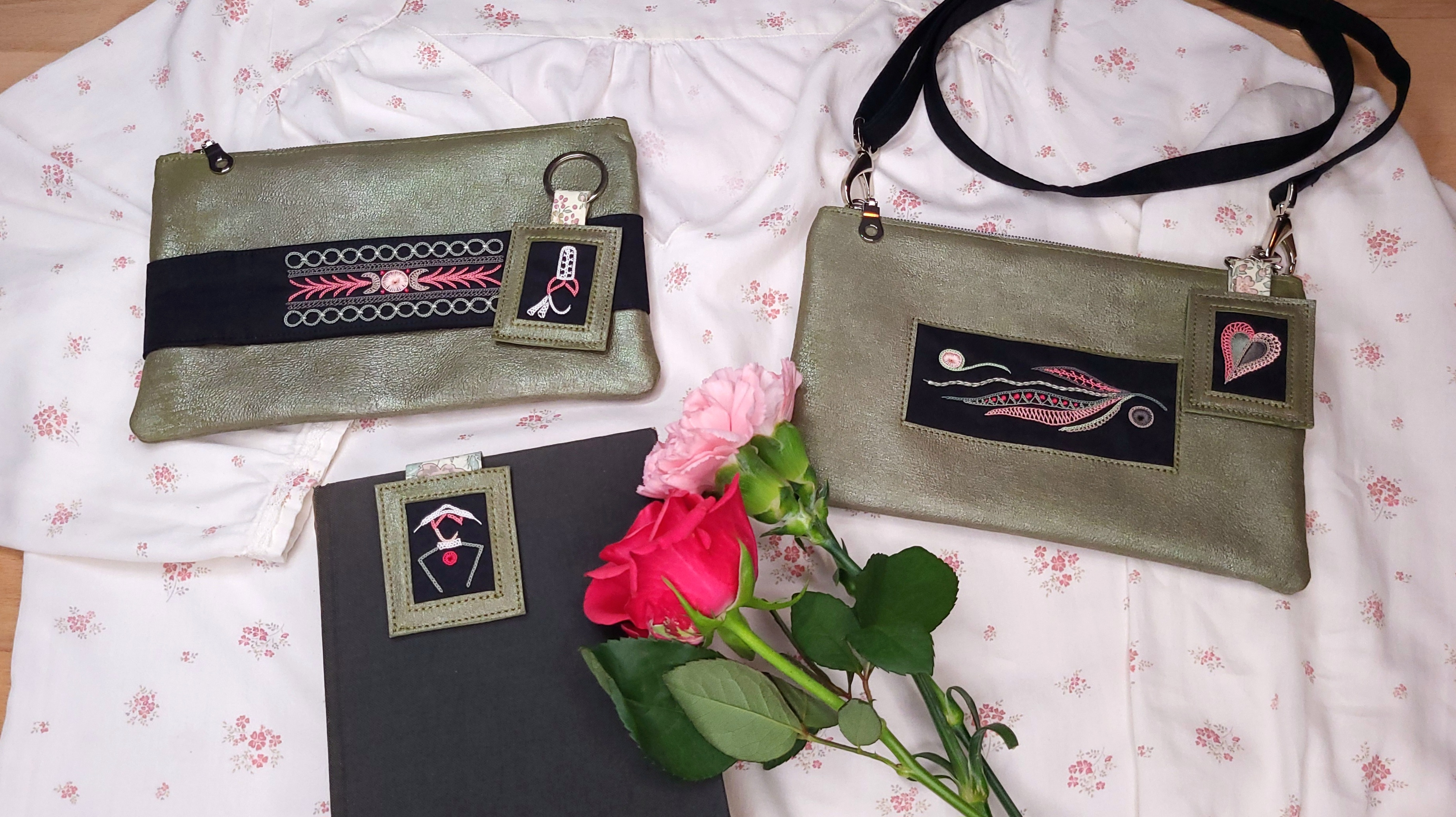 La broderie, dont je crée le dessin, est la pièce maîtresse de votre futur accessoire. Elle est réalisée entièrement à la main, en utilisant la technique de la broderie Glazig. Je choisis les couleurs des fils avec attention pour s’harmoniser au mieux avec le cuir et la doublure, pour avoir un résultat tantôt doux, tantôt chatoyant !