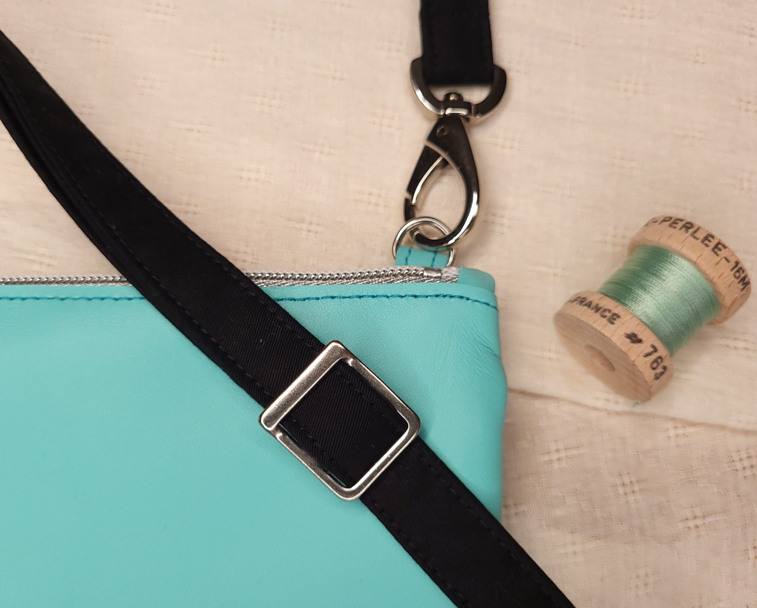Elle est réalisée en cuir d’agneau lisse turquoise, souple et très doux au toucher. Doublure en coton Liberty® Betsy aux teintes bleues et vert d’eau.