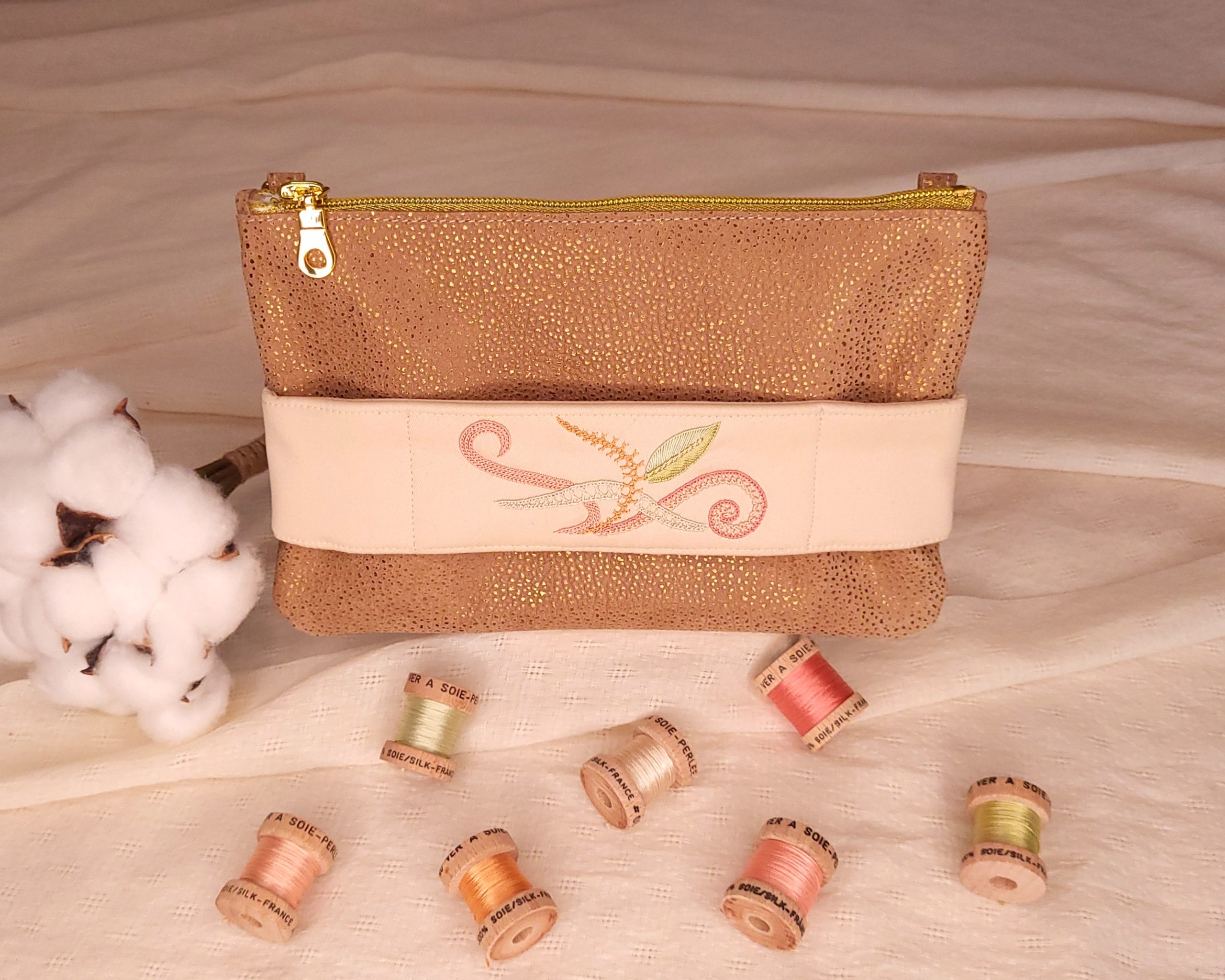 La bande brodée permet de glisser la main en dessous, pour porter la pochette éventuellement sans bandoulière. La broderie se posera alors comme un bijou brodé sur votre main.