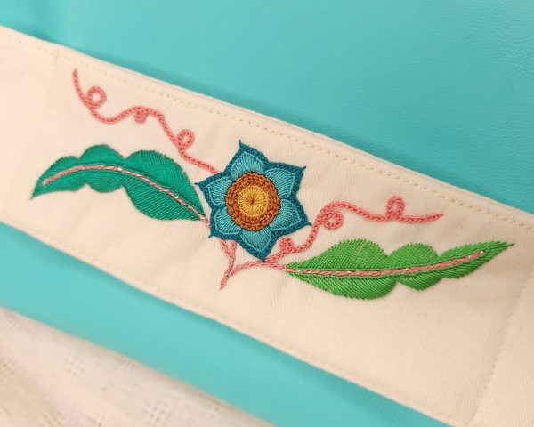 La bande brodée permet de glisser la main en dessous, pour porter la pochette éventuellement sans bandoulière. La broderie se posera alors comme un bijou brodé sur votre main.