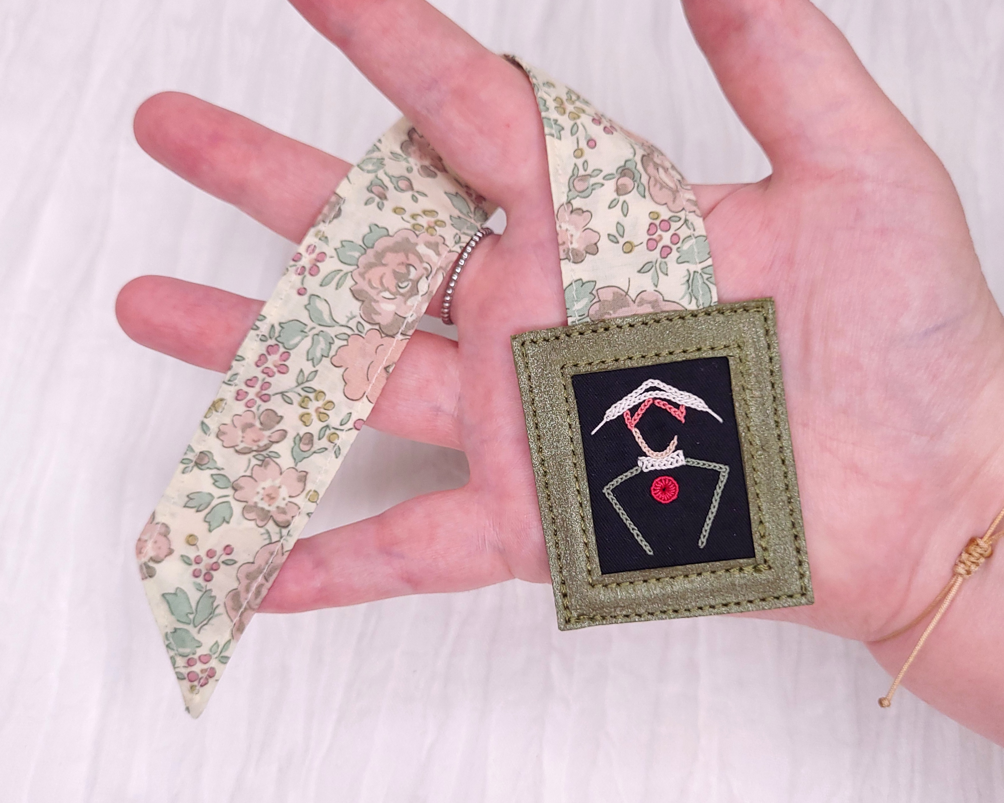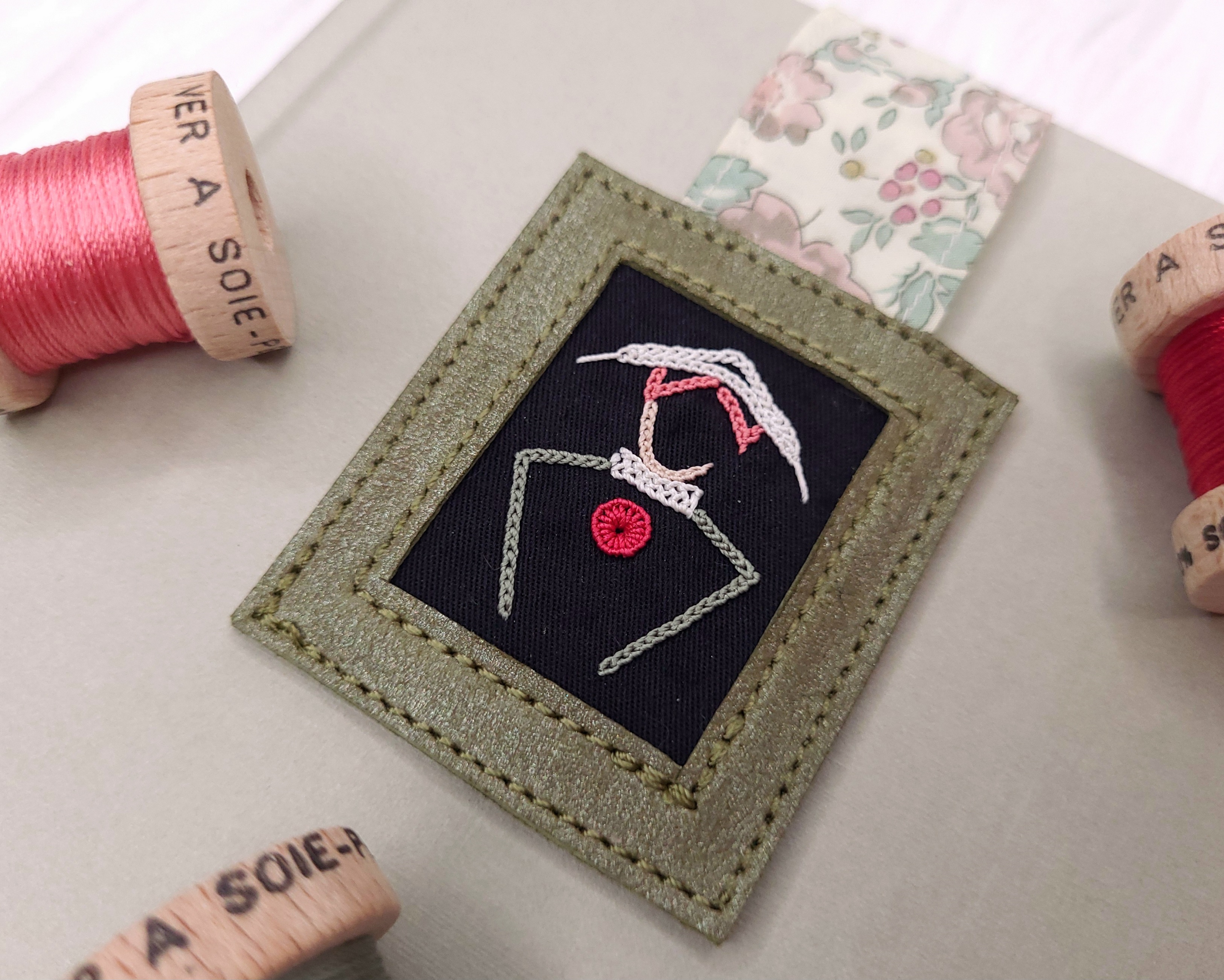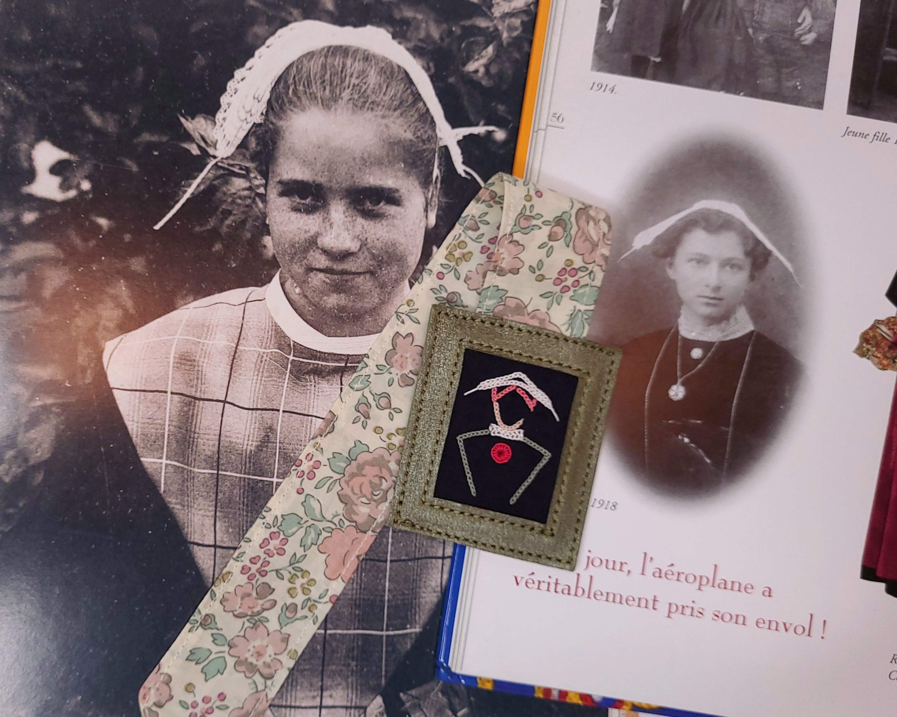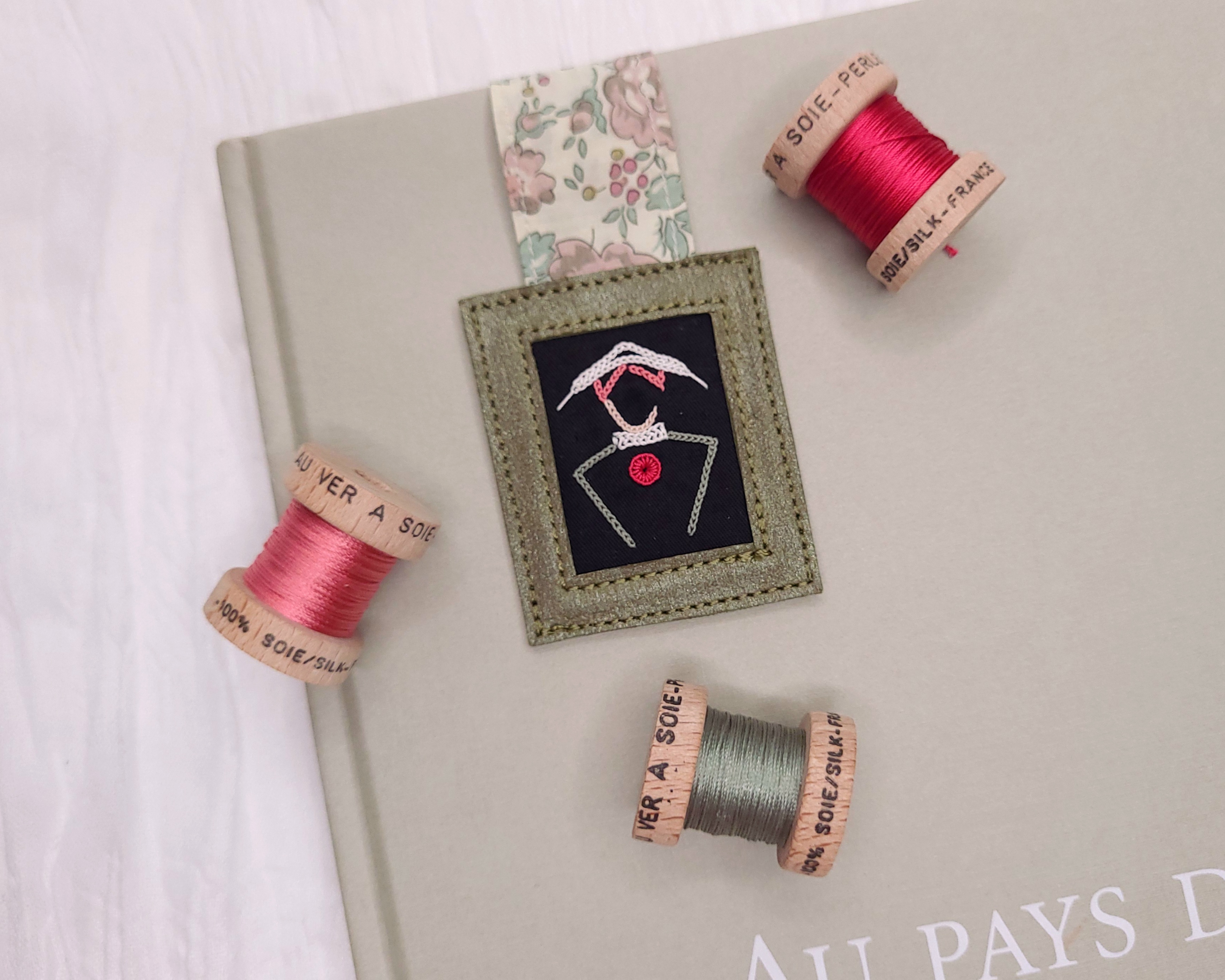 La broderie du marque-page est réalisée à la main avec des fils de soie, en utilisant les techniques et points de broderie Glazig (broderie traditionnelle des anciens costumes hommes de la région de Quimper).
