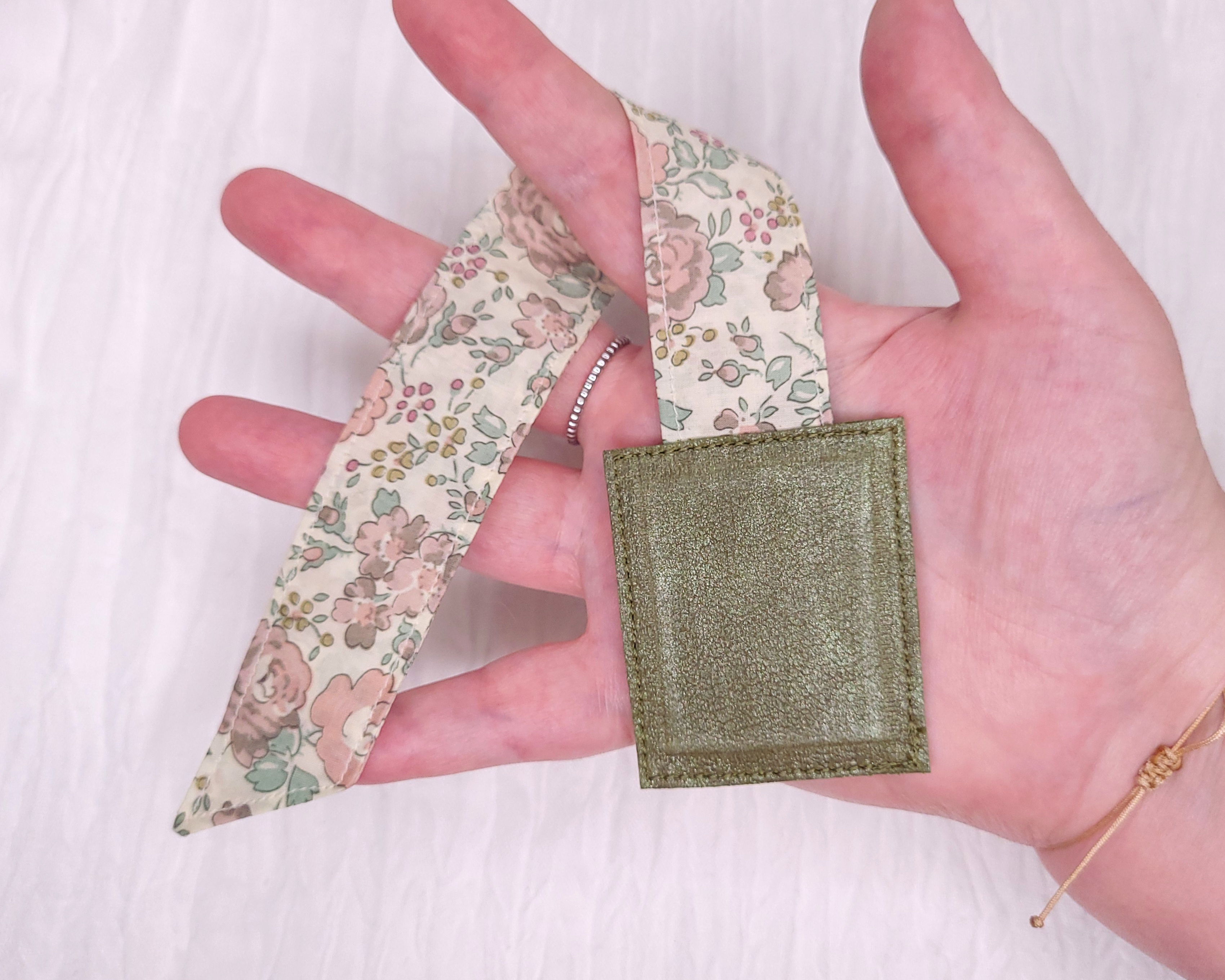 Elle est encadrée de cuir de chèvre vert, brossé argent, qui recouvre également l’arrière du marque-page. La languette en coton Liberty® Felicite aux couleurs douces, se glisse entre les pages de votre livre en cours de lecture.