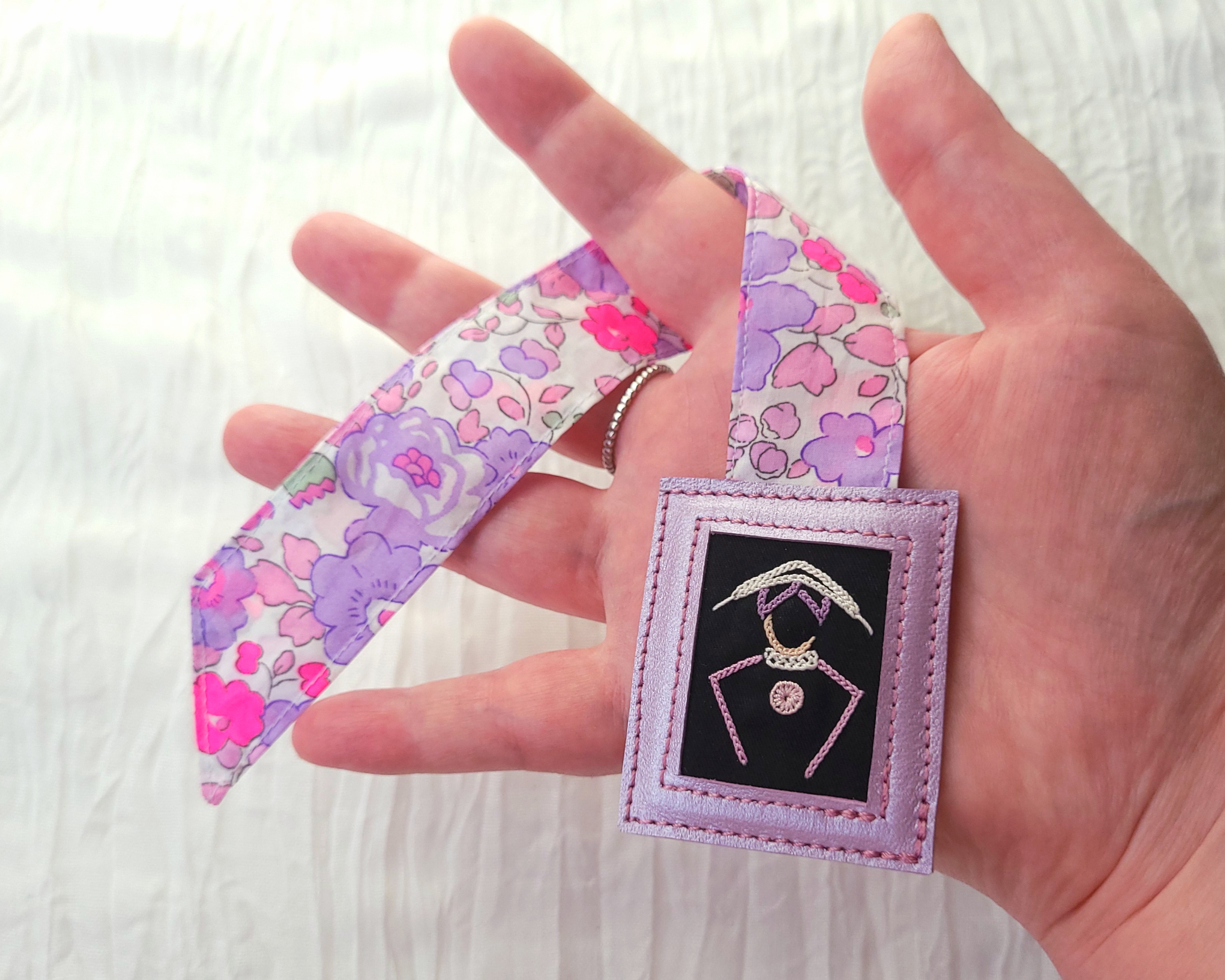 Elle est encadrée de cuir d’agneau violet nacré qui recouvre également l’arrière du marque-page. La languette en coton Liberty® Betsy lilas et rose fluo, se glisse entre les pages de votre livre en cours de lecture.
