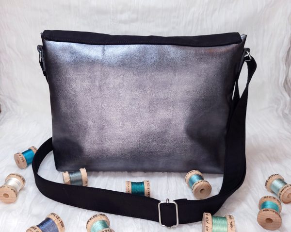 La besace est confectionnée en cuir de vachette lisse noir argenté et doublée de coton Liberty® Adelajda de teinte parfaitement assortie au cuir.