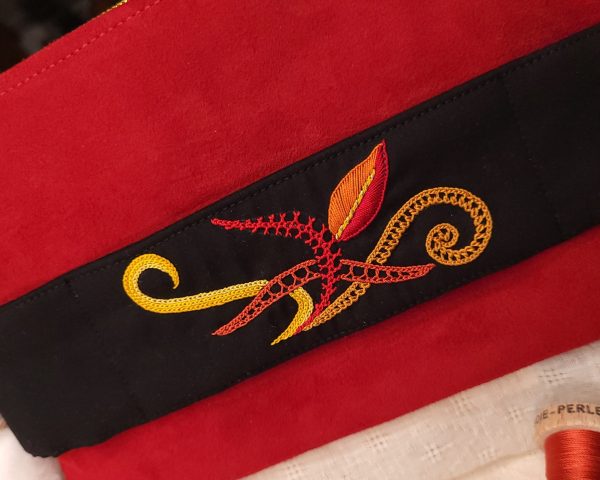 Pochette brodée main, en cuir de chèvre velours rouge, accompagnée d’une broderie flamboyante !